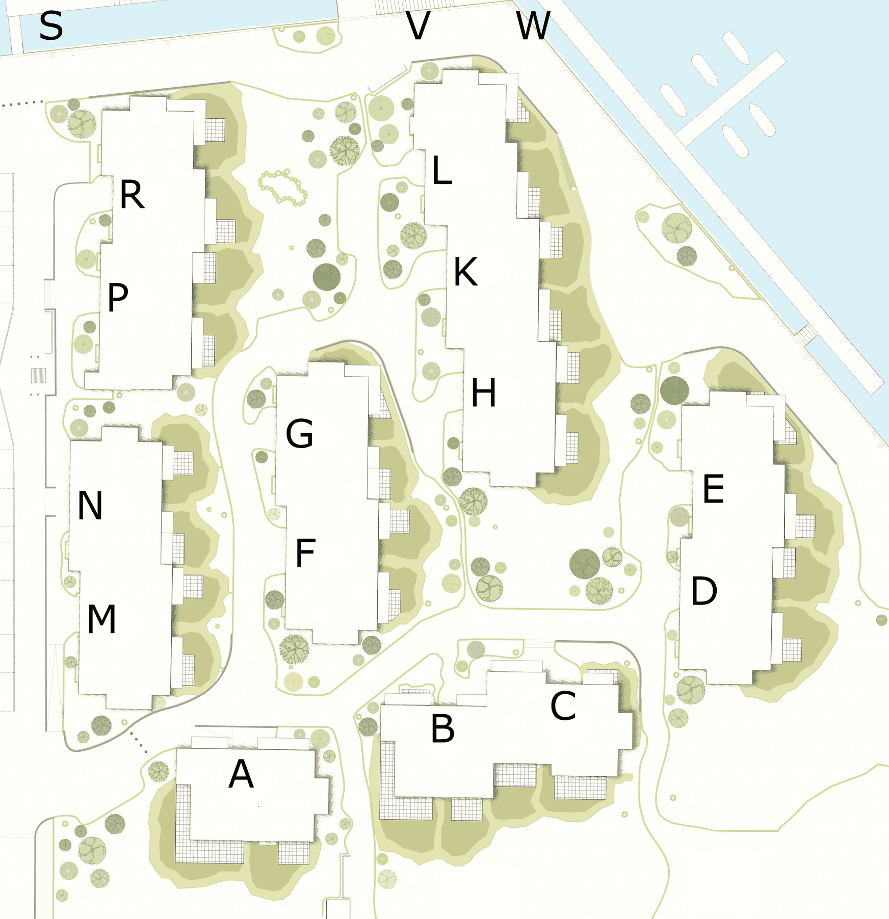 Husene er opført med varierende etagehøjder samt forskudte facader, hvilket er med til at optimere udsigten til vandet fra hver bolig. Den afvekslende form bidrager desuden med et levende udtryk, der giver oplevelser for øjet.